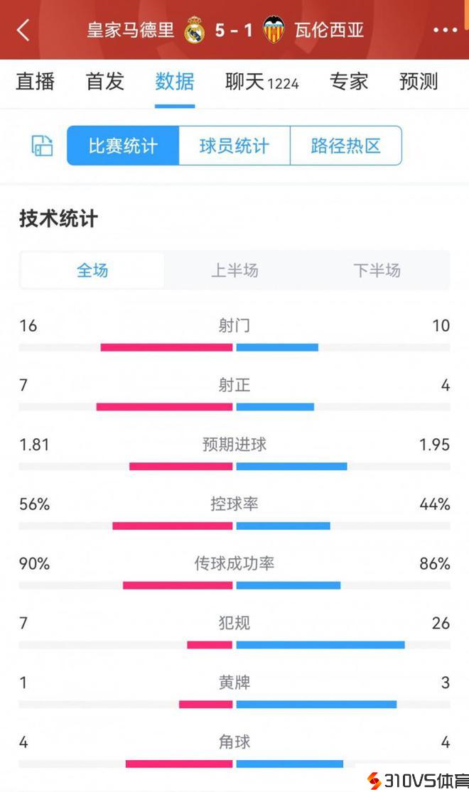 皇马5-1瓦伦全场数据对比:射门16-10,射正7-4,犯规7-26