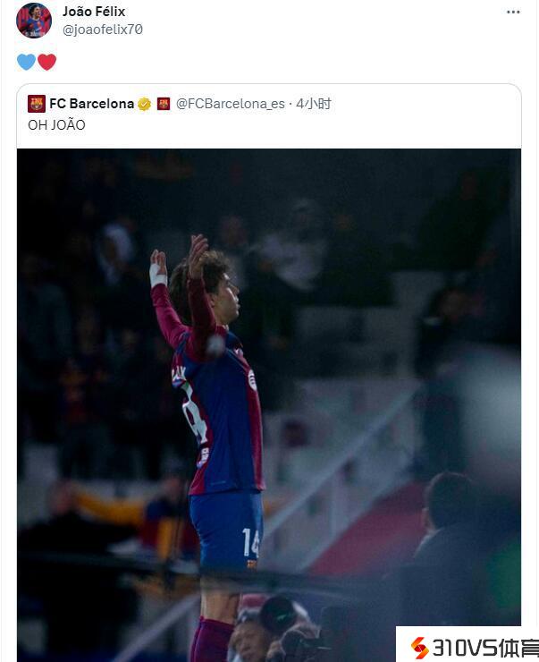 示爱!巴萨晒菲利克斯庆贺照,球员转发:❤️