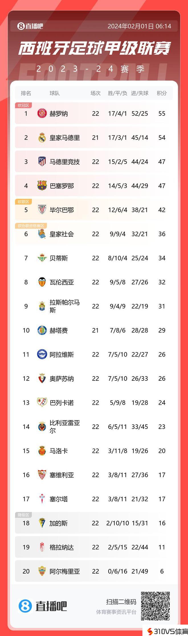西甲积分榜:马竞3连胜居第三,巴萨与马竞同分排第四