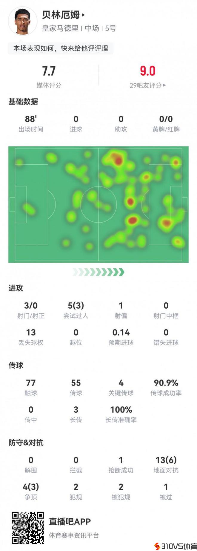 贝林厄姆本场数据:4次关键传球,传球成功率91%,获评7.7分