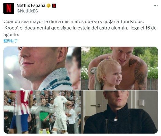 网飞在社媒写道:“如果我老了的话,我就会告诉自己的孙子孙女,我之前看过克罗斯踢球。位德国球星的纪录片《克罗斯》将于8月16日上线。”