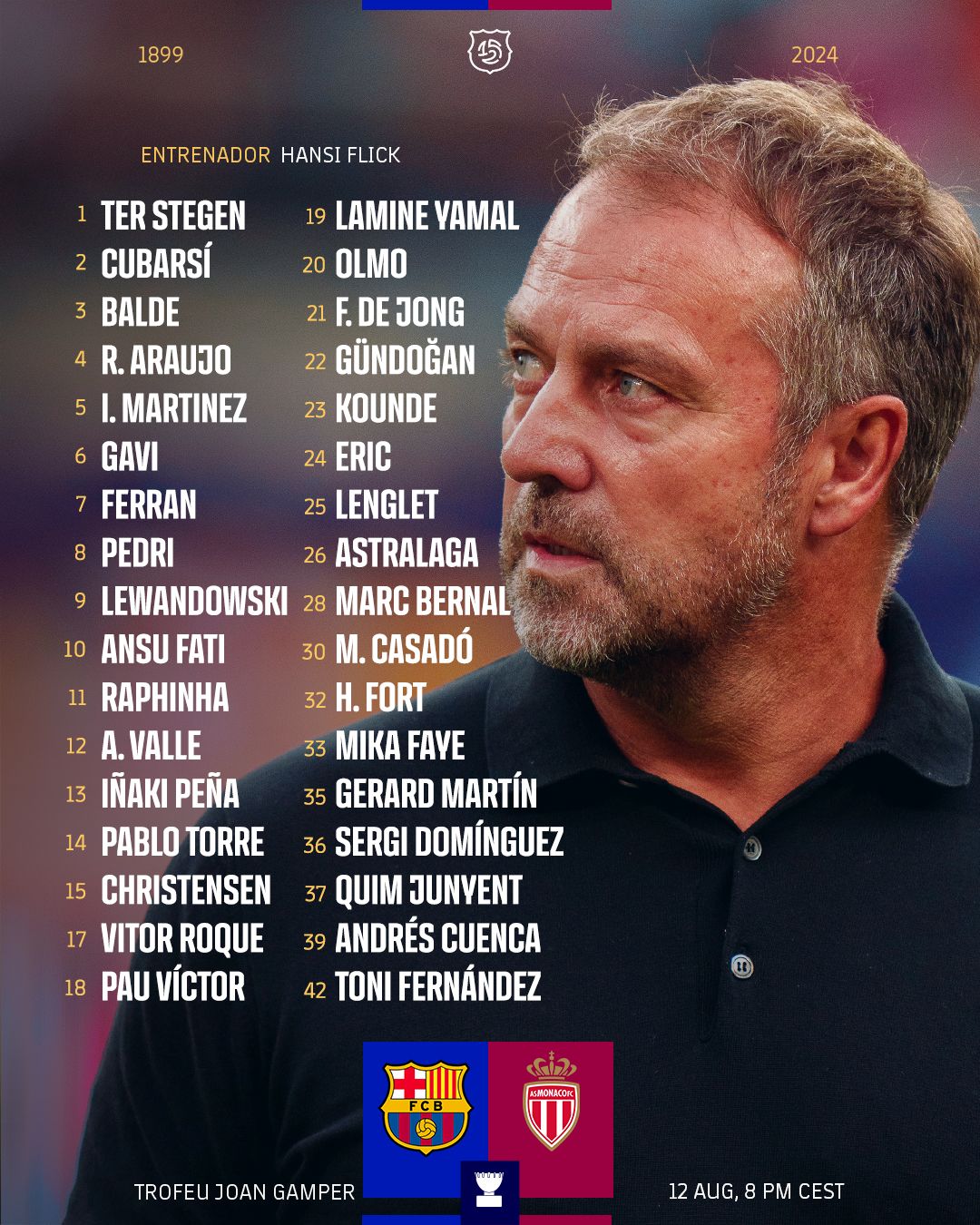 巴塞罗那足球俱乐部官方公布了甘伯杯的参赛大名单及球衣号码分配,球队将在北京时间8月13日凌晨2:00对阵法甲球队摩纳哥。