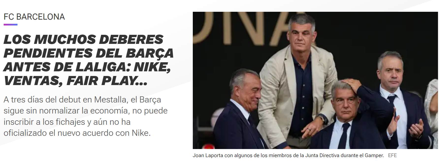巴萨与耐克之间的赞助合同也尚未宣布,续约谈判已经持续了数月,但还存在一些问题要解决。如果双方达成协议,这将可能成为解锁巴萨目前财政难题的钥匙,因为这能很大的提升球队的收入,从而提升薪资空间。