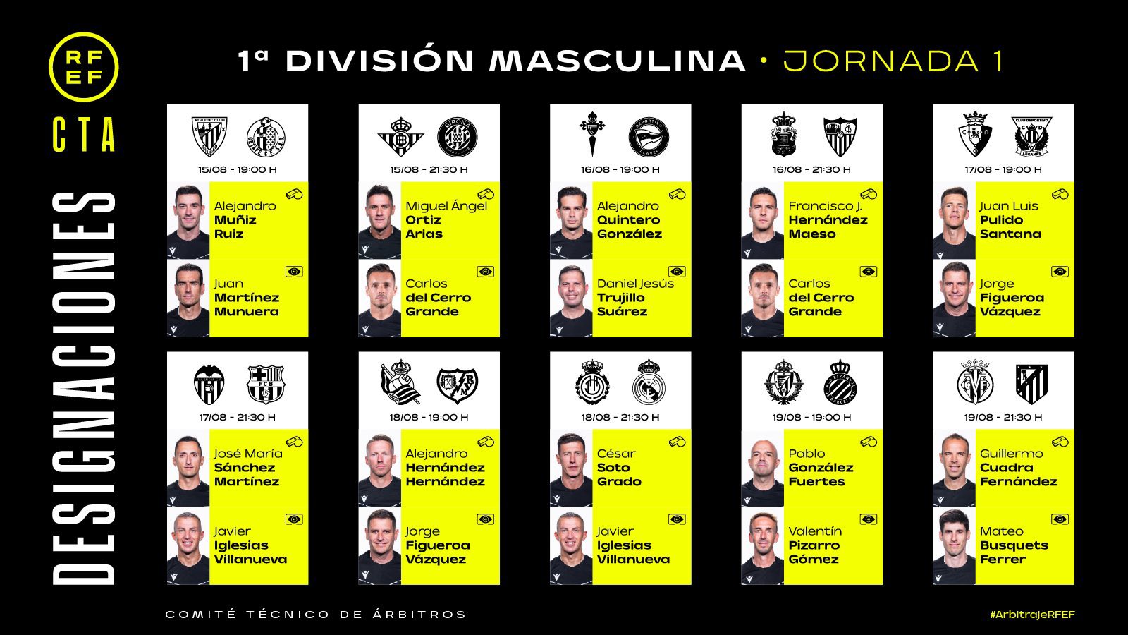 北京时间8月15日讯 今日凌晨西甲联赛将正式拉开帷幕,日前,西甲联赛裁判技术委员会(CTA)已经正式公布了首轮西甲的裁判选派。
