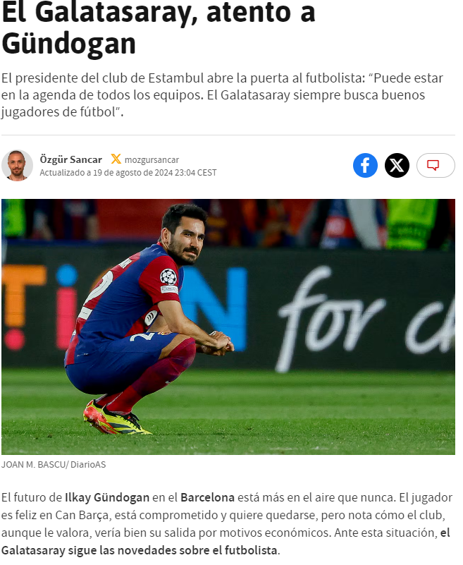 在巴萨方面决定让京多安离队的情况下,西班牙媒体《阿斯报》的报道透露, 加拉塔萨雷主席厄兹贝克在接受采访时表示,如果京多安真的决定离开巴萨,加拉塔萨雷欢迎他的加入。