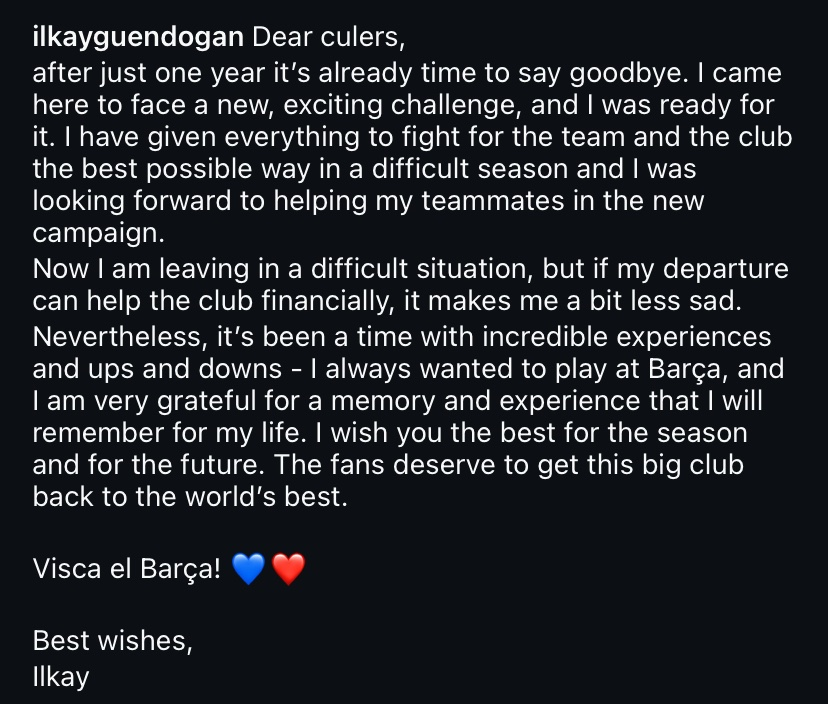北京时间8月23日,33岁的德国中场京多安官宣离开巴萨重回曼城,他本人也在社交媒体上发布了一则亲笔信,向效力了一年的巴萨及巴萨球迷道别。