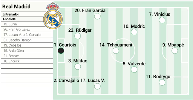后卫:弗兰-加西亚、吕迪格、米利唐、卡瓦哈尔/巴斯克斯