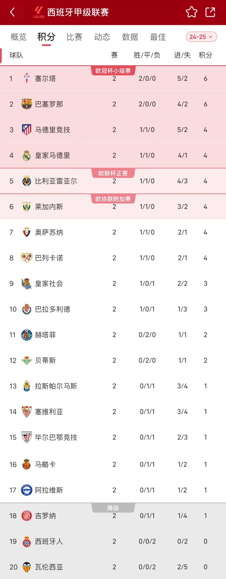 西甲联赛两轮战罢,塞尔塔和巴塞罗那成为本赛季西甲仅有的2连胜球队。