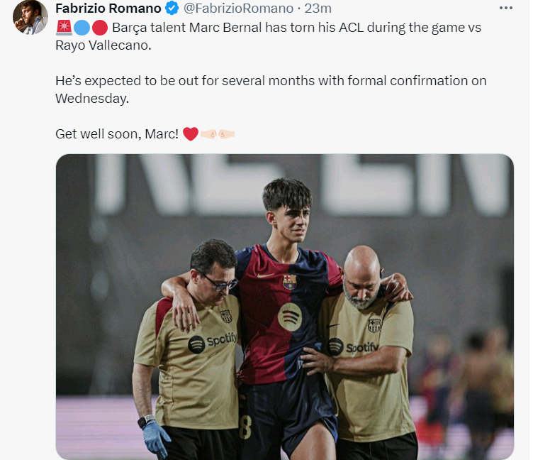 罗马诺在社媒谈到了伯纳尔的伤情:“巴萨的年轻天才伯纳尔,在同巴列卡诺的比赛中前交叉韧带撕裂,预计将缺席几个月的时间。周三将正式确认伤情,希望他能够尽快好起来。”