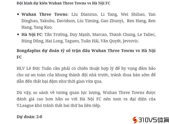 他们并不看好越南卫冕亚军河内FC队,以为武汉三镇很能够拿到成功。该网站,甚至预测了双方的出场阵容。