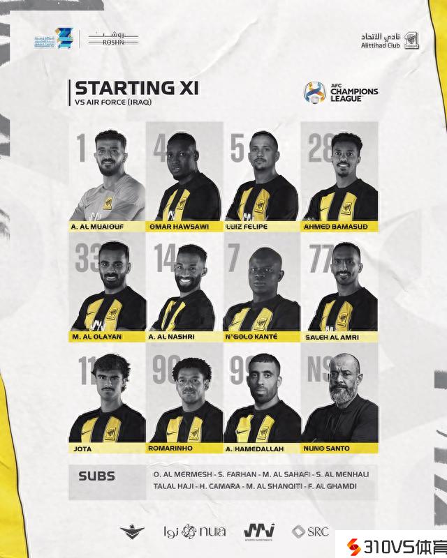 吉达结合亚冠首发:坎特领衔,本泽马法比尼奥未入大名单