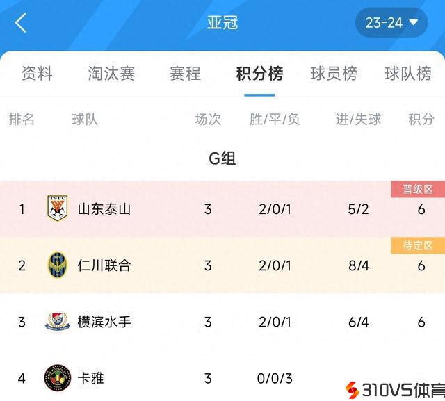 亚冠G组积分榜:泰山6分登顶,仁川、横滨同分暂居2、3位