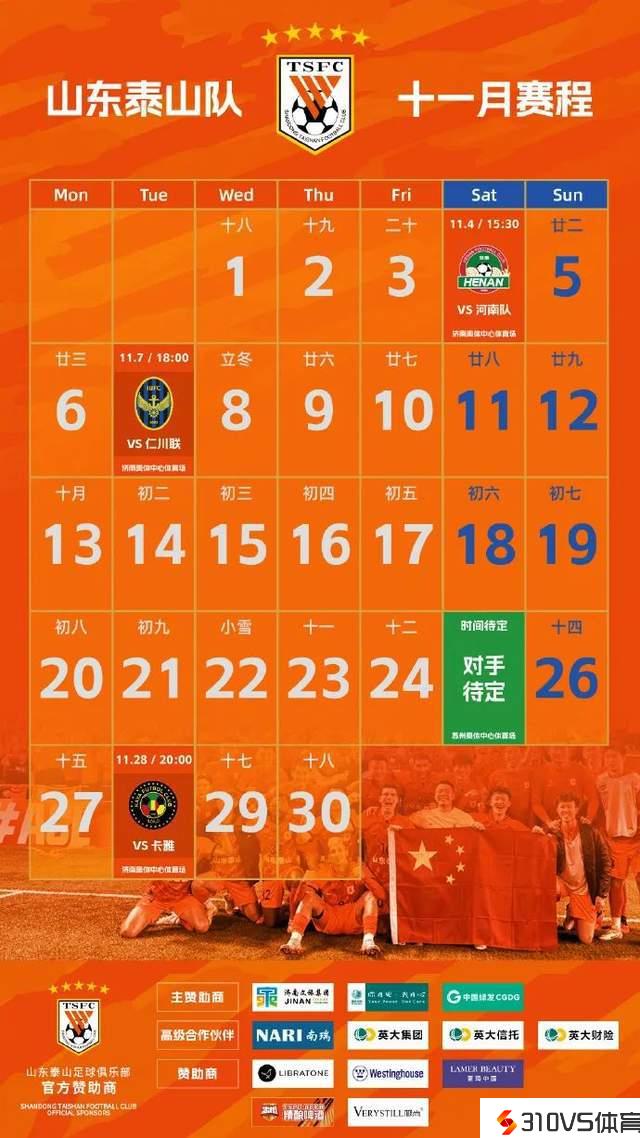 泰山队11月份赛历出炉!主场战河南轻装上阵,两场关键战不容有失