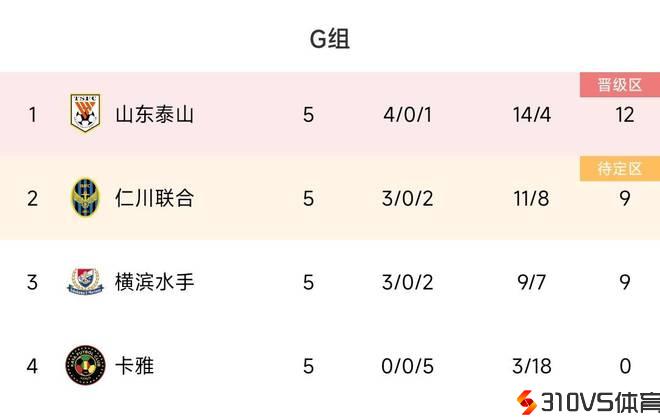 不输2球以上即可出线!亚冠G组:泰山12分,仁川联横滨水手9分