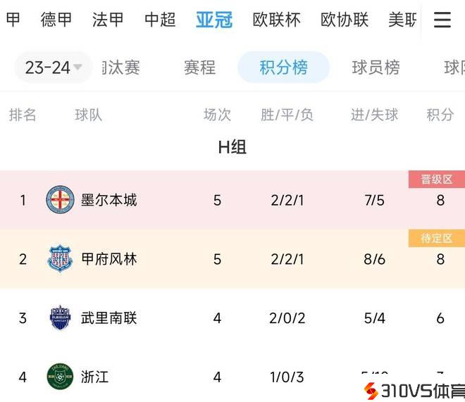 亚冠H组实时积分:墨尔本城甲府风林同积8分,浙江不胜就出局