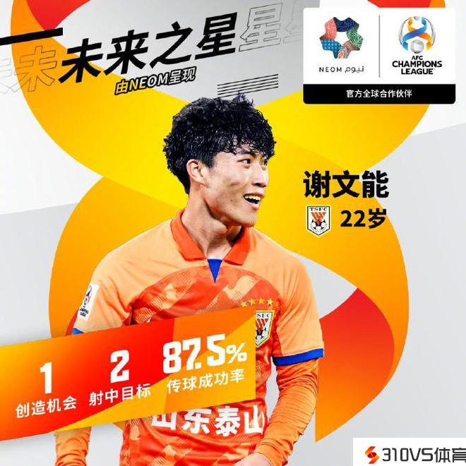 亚冠官方:山东泰山前锋谢文能中选第五竞赛日未来之星