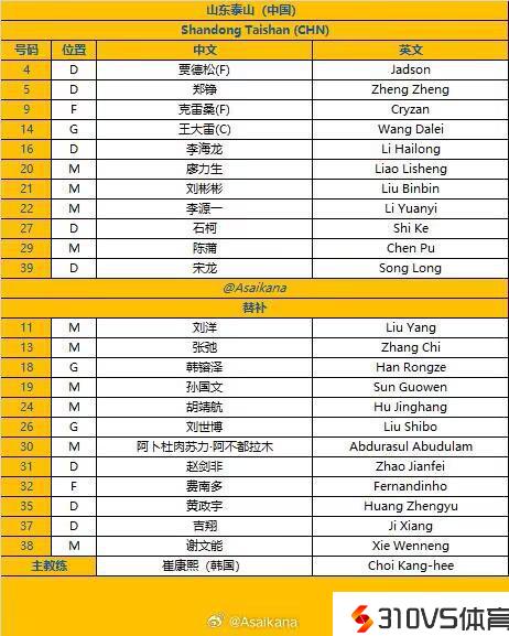 亚冠小组赛收官战-泰山vs横滨首发:克雷桑、贾德松、李海龙出战
