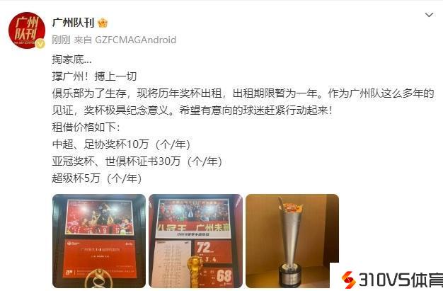 北京时间1月21日晚,依据知名博主“广州队刊”的泄漏,广州队曾经地下对外出租俱乐部的历年奖杯,出租期限暂为一年。其中,中超冠军奖杯为10万元人民币一年,亚冠冠军奖杯则是30万元人民币一年。此外,世俱杯证书的租金也是1年30万元人民币。超级杯奖杯,则是5万元人民币1年。广州俱乐部还着急喊话:有意向的球迷赶忙举动起来。