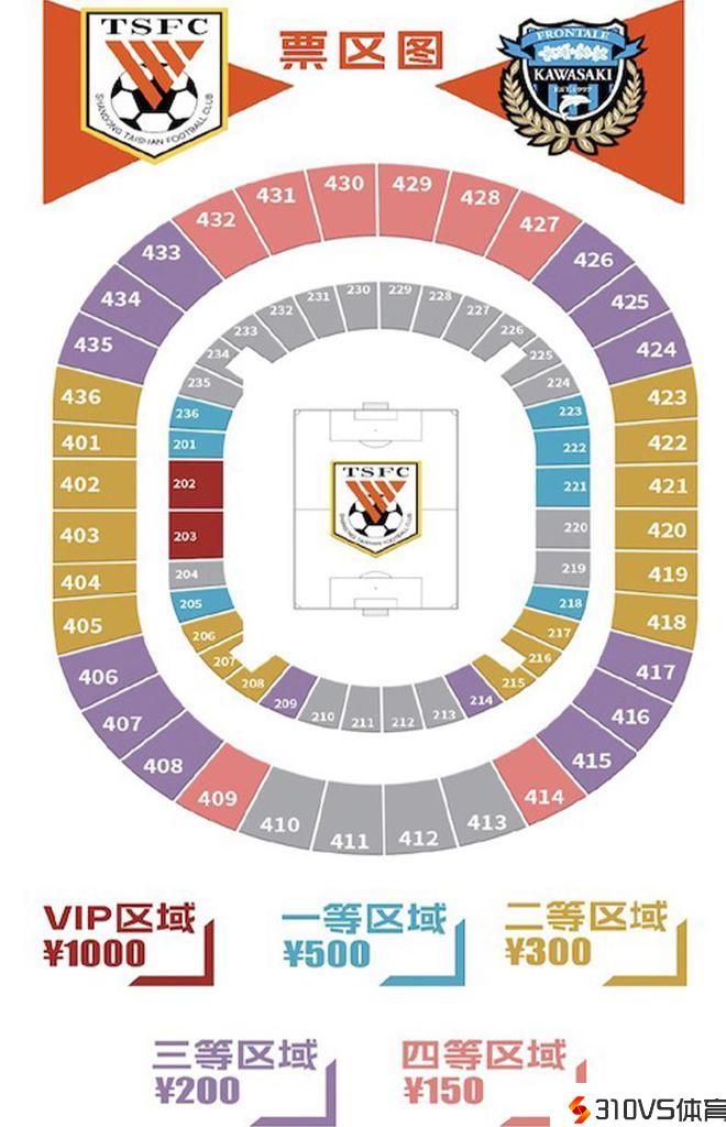 山东泰山亚冠1/8决赛对手是日本球队川崎前锋,首回合竞赛时间为2月13日18点,泰山坐镇济南奥体中心作战,1月23日,山东泰山俱乐部官方发布了主场票务公告,票价分5档,区分为:四等区域150元,三等区域200元,二等区域300元,一等区域500元,VIP区域1000元。次回合将于北京时间2月20日晚16点停止。