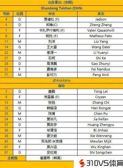 亚冠泰山队vs横滨水手首收回炉:帕托费南多先发,克雷桑替补