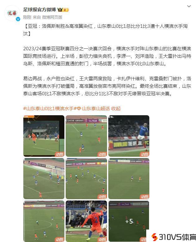 亚冠:洛佩斯制胜&高准翼染红,山东泰山0比1总比分1比3遭十人横滨水手淘汰