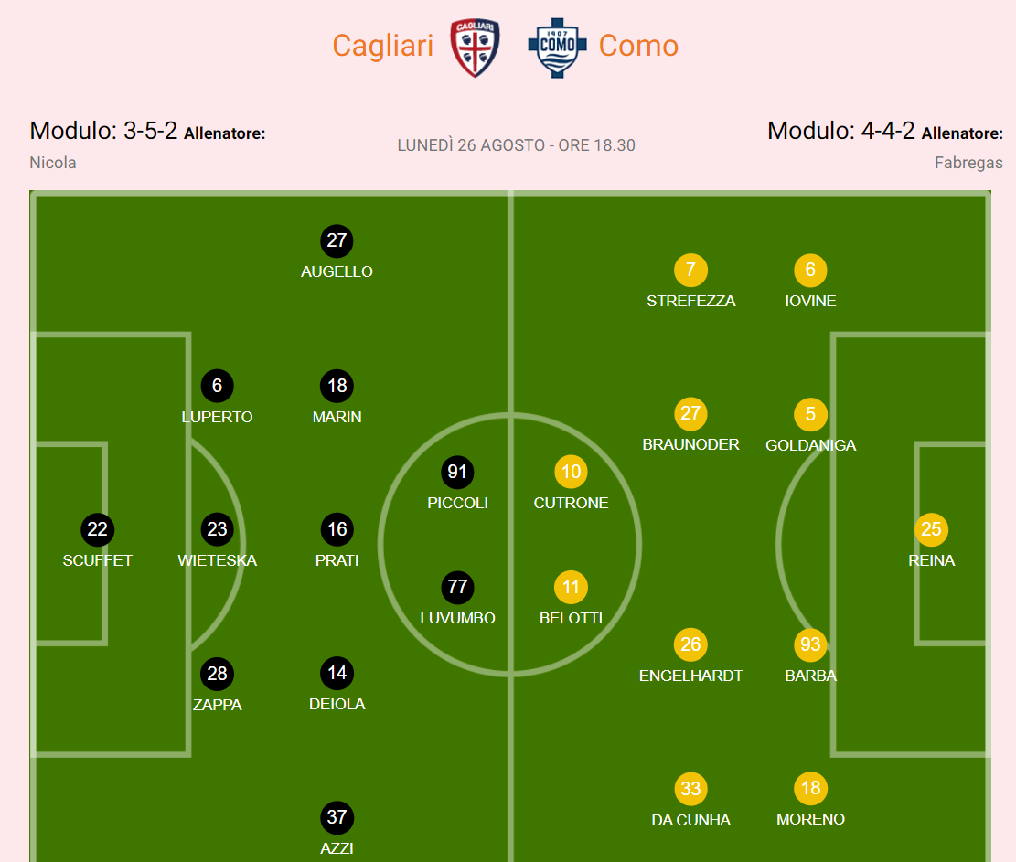两支球队都在今夏进行了换帅,卡利亚里选择了执教过近10支意甲、意乙小球队的51岁教练大卫-尼科拉,科莫则选择了独立执教经验并不丰富的37岁前西班牙足球明星法布雷加斯。转会方面两队策略也不同,卡利亚里小修小补,出售多塞纳、苏莱马纳等人回笼1670万,然后花费1130万引进几名新援,磨合难度小一些。科莫则一举花费了4650万欧元引进了瓦拉内、贝洛蒂等十多名新援,经历了彻底的换血。