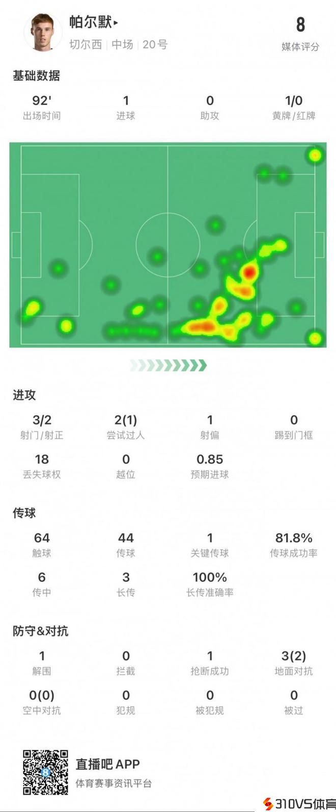 帕尔默全场数据:1粒进球,3次射门2次射正,18次丧失球权