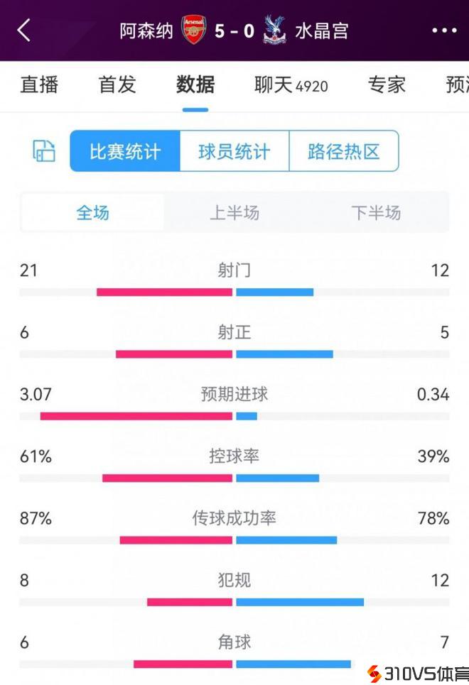 枪手6射正进5球!阿森纳5-0水晶宫全场数据:射门21-12,射正6-5
