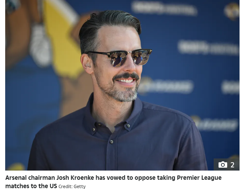 《太阳报》报道,阿森纳联合主席乔希-克伦克表态,尽管美国的广播公司提供了巨额的报价,但他仍反对在美国进行英超联赛的赛事。