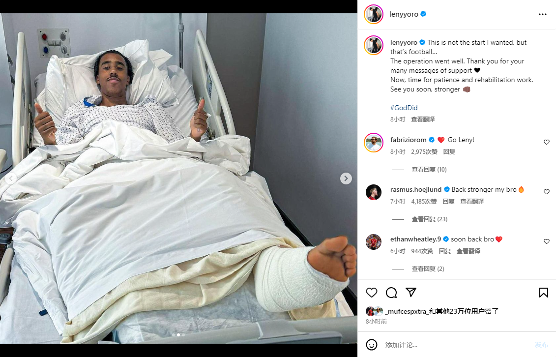 包括队友霍伊伦和记者罗马诺在内多人在约罗的社交媒体下面评论回复为其加油鼓劲。他本人也引用了圣经中的一段话,“你现在不会明白我在做些什么,但接下来你会理解!”