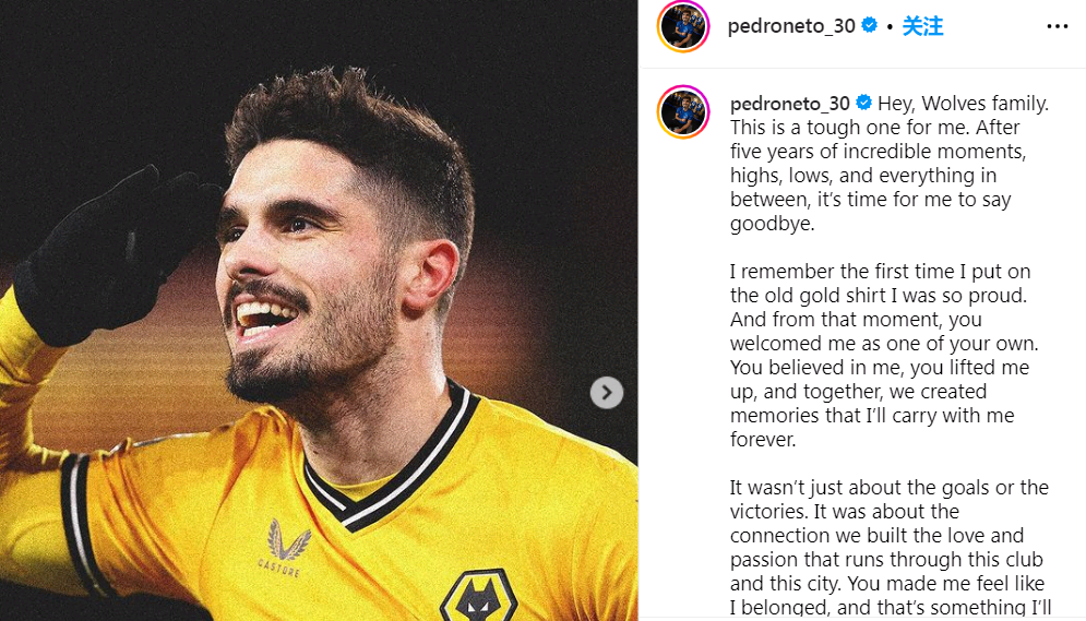 内托在INS写道:“离开狼队的决定,对我来说真的很难。在这里我经历了不可思议的5年,跟随球队经历高潮以及低谷,是说再见的时候了。我仍然记得,在首次穿上狼队的球衣时,我的内心充满了骄傲和自豪,这支球队相信我、鼓励我,我对此将永远铭记。我对这里的记忆不仅仅是进球或胜利,而是贯穿整个俱乐部乃至整座城市的爱和激情,我在这里有了归属感,对此是永生难忘的。离开并不容易,但我知道这不是结束,而是职业生涯的全新篇章,我会将狼队永远铭记于心。感谢狼队对我所做的一切,我会永远想念这里,我会在任何的其他地方为你们加油。”