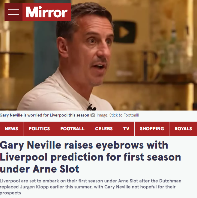 夏窗零引援!内维尔看衰利物浦:斯洛特带队难成功 新赛季进不了前6