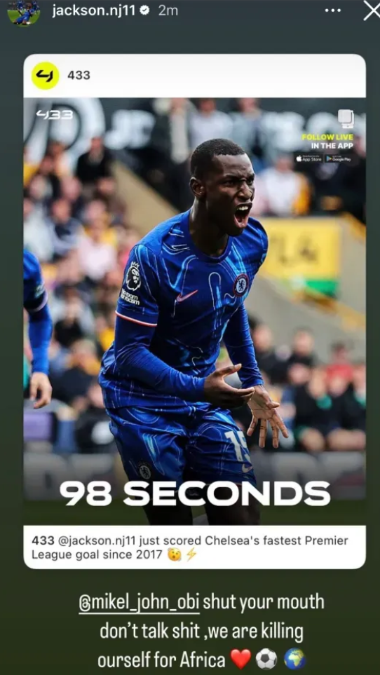 对此杰克逊并不接受,他晒出了自己取得切尔西2017年来英超最快进球的图片,并写道:“米克尔,闭上你的嘴,别喷了,我们非洲人正在自相残杀。”