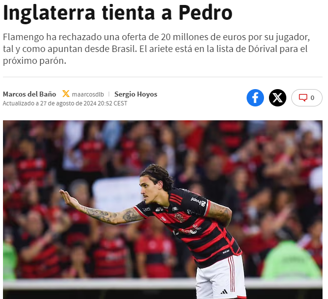 阿斯报援引巴西媒体报道称,诺丁汉森林有意签下弗拉门戈的中锋佩德罗,但他们提出的2000万欧报价已经被拒绝。