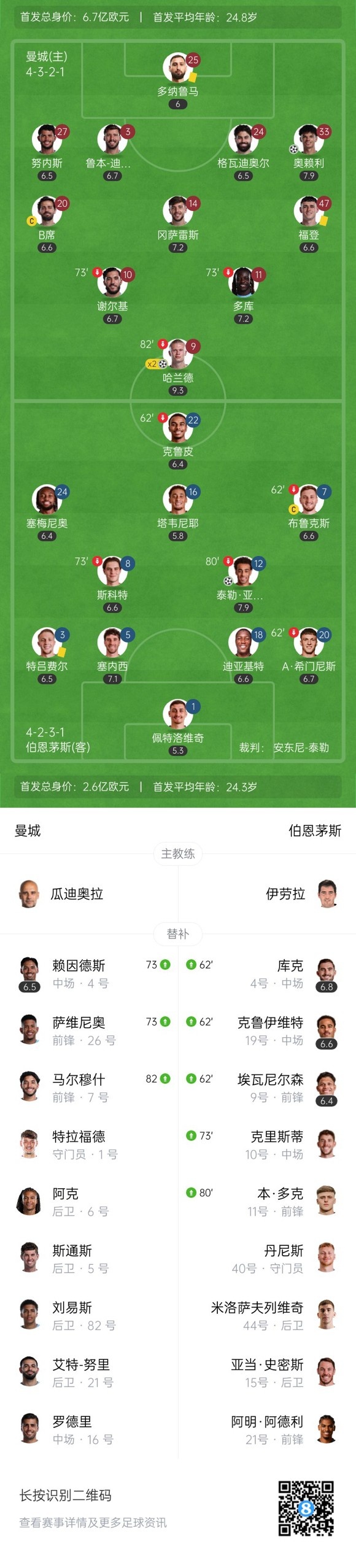 半场结束,曼城2-1伯恩茅斯。