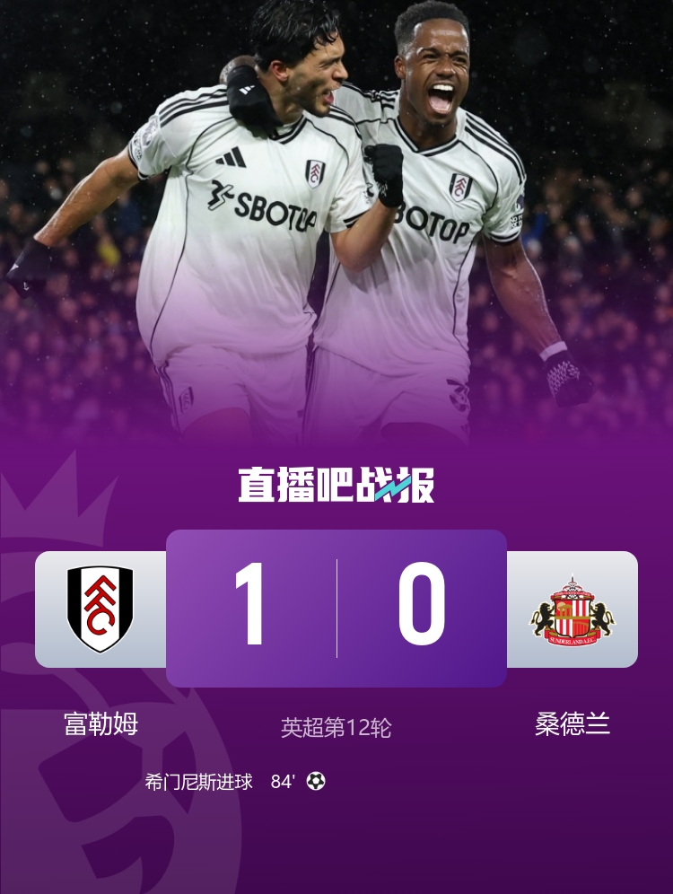第85分钟,丘库埃泽前场左侧肋部送出精准传中,希门尼斯抢点打破僵局,富勒姆1-0桑德兰。↓