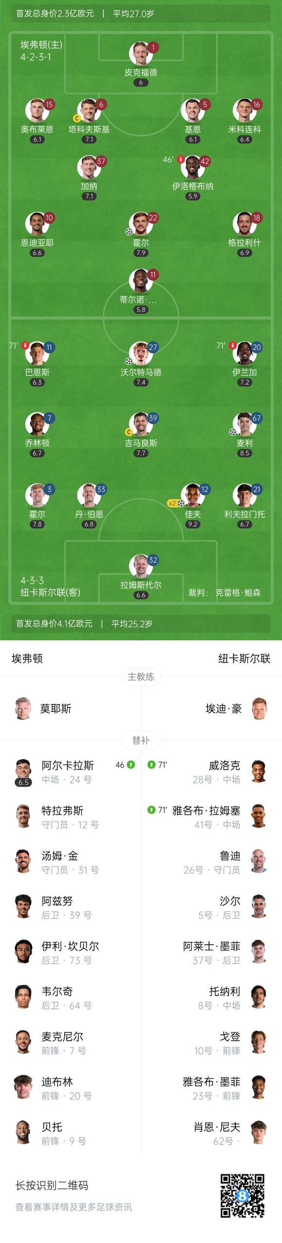 第57分钟,纽卡再下一城!霍尔左路传到禁区后点佳夫高高跃起头球破门,埃弗顿0-4纽卡。↓
