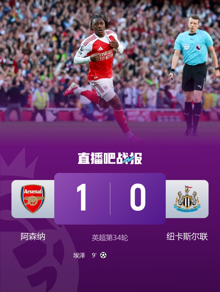 4月26日讯 北京时间4月26日凌晨0时30分,2025-26赛季英超第34轮在酋长球场展开角逐,阿森纳主场迎战纽卡斯尔联。上半场埃泽远射首开记录,哈弗茨战术角球助攻+伤退,下半场埃泽伤退。最终阿森纳主场1-0战胜纽卡...发表于:04月26日