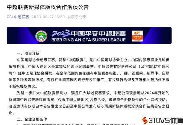 正在招商!中超启动新周期联赛版权协作洽谈 需有一定阅历