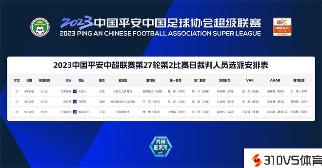 其中,17:30,北京国安将在主场北京工人体育场,迎战大连人。来自新疆的裁判员麦麦提江,将担任主裁判;第一助理是来自河南的国际级助理裁判员曹奕,第二助理是来自安徽的席飞;第四官员是来自河南的单丹奥;视频助理裁判是来自西安的张龙,助理视频助理裁判是来自河南的杨德霖;裁判监视是来自天津的王津。