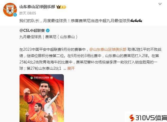 据悉,在9月份最佳球员评选中,他在媒体评委会投票环节取得57分,在球迷微博投票环节,他取得30分满分,最终他以87分中选为9月的中超最佳球员。由于此前他宣布本赛季完毕之后离队,还有3场中超1场足协杯4场亚冠,这将是费莱尼在国际足坛的绝唱,正可谓且行且珍惜,希望费莱尼继续证明自己,协助泰山队取得佳绩。