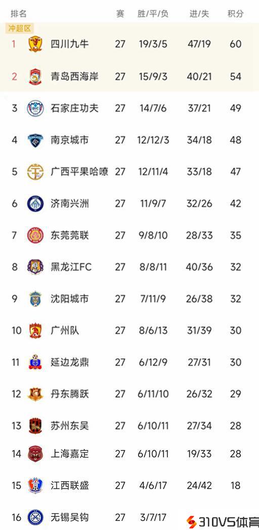 中甲最新积分榜:九牛第一,石家庄紧追青岛,南京广西冲超落伍