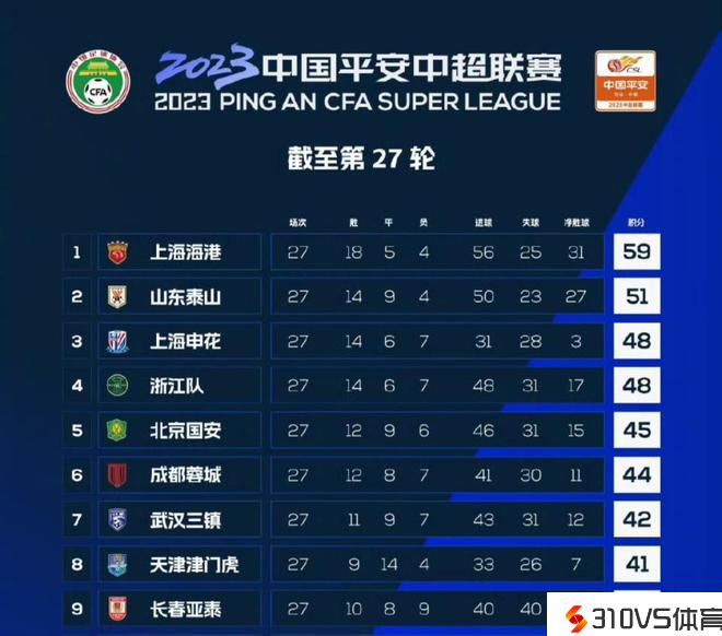 27轮战罢,上海海港18胜5平4负,积59分,高居榜首。山东泰山14胜9平4负,积51分,位列第二,在只剩3轮的状况下,两队相差8分。而第三名上海申花48分,曾经确定无缘冠军。