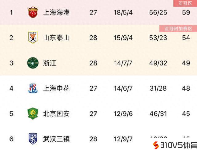 中超积分榜:泰山剩两轮距海港5分,海港今夜赢球就夺冠