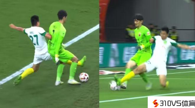 上半场海港0-1落后国安,颜骏凌在门前处置球优柔寡断,王刚机敏上抢破门,斩获团体的赛季首球。上半场的补时阶段,买提江打破进禁区后被李磊身后犯规,主裁第一时间判罚点球,不过回看VAR之后点球的判罚被取消。