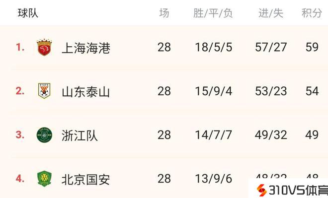 28轮战罢,上海海港取得18胜5平5负的效果,积59分位居榜首。