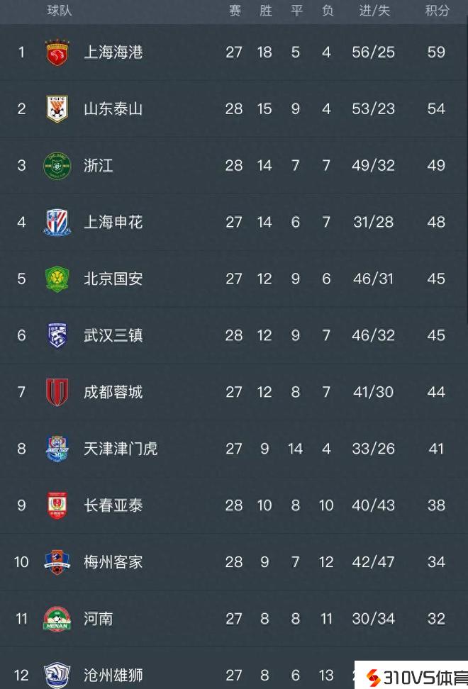 中超最新积分榜:山东泰山稳居第2,距离榜首只差5分!三镇升6