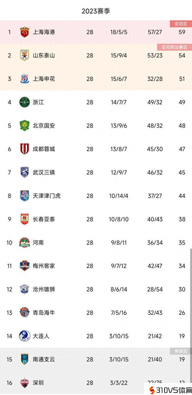 剩2轮❗中超积分榜:海港抢先泰山5分领跑 蓉城第6 深圳提早升级