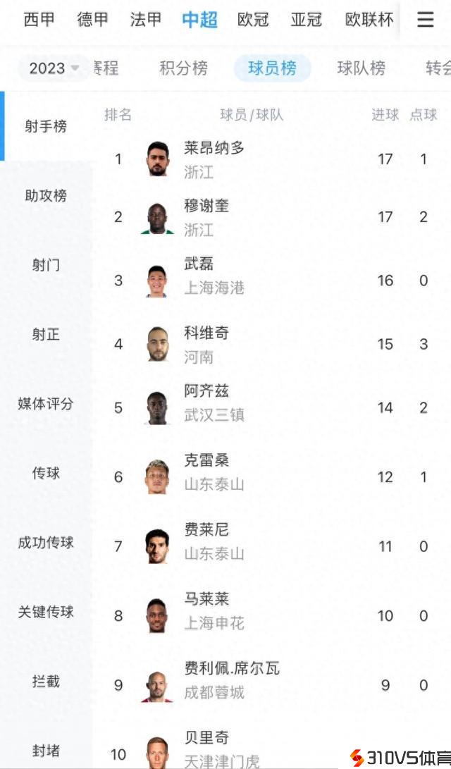 中超第28轮射手榜:穆谢奎17球追平莱昂纳多,武磊16球第三