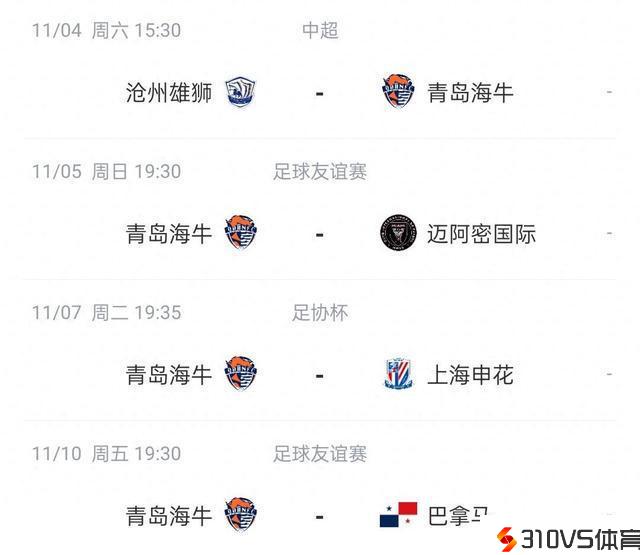 忙海牛11月一周四赛:4日中超,5日海口战迈阿密,7日足协杯